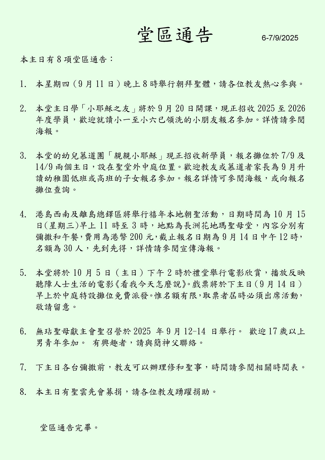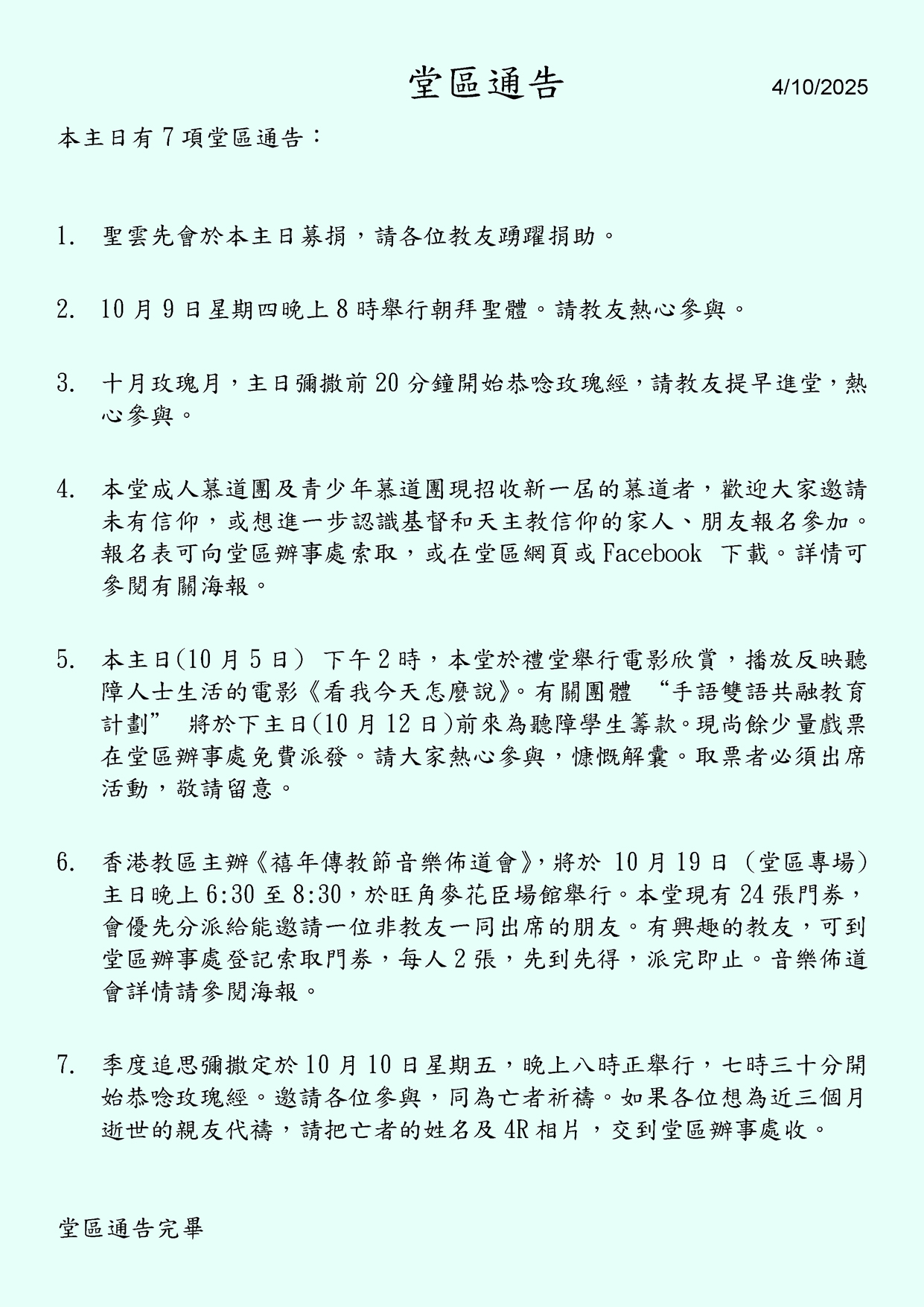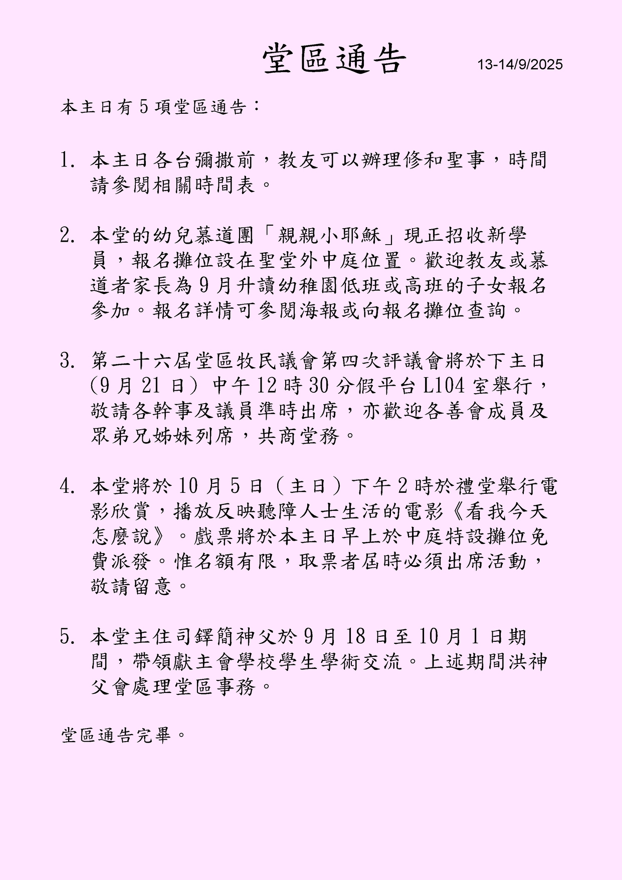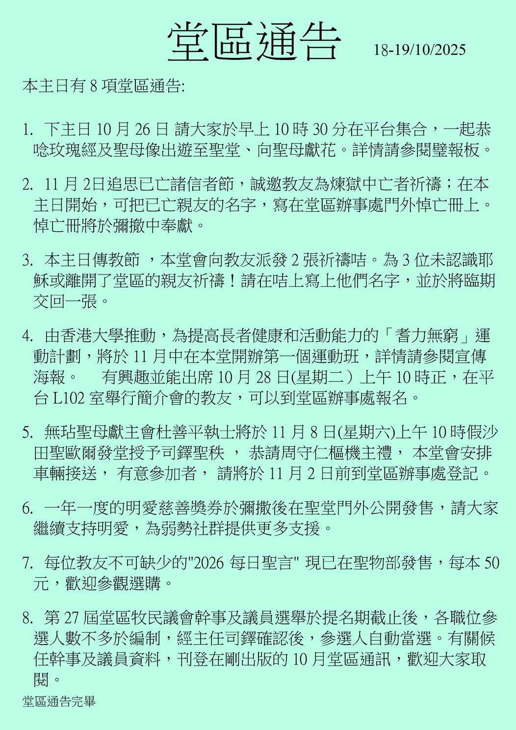 | 主 日 彌 撒: | 7:30am, 9:30am, 11am, 2pm(Eng), 7pm |